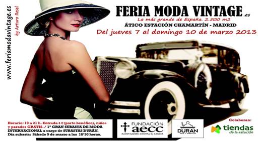 El día 7 de marzo vuelve la Feria de Moda Vintage, en las naves del ático de la Estación de Chamartín. Una edición de primavera con más de 70 expositores nacionales e internacionales, para ir entrando en la época de los almendros en flor y de las golondrinas, que ya es hora!!