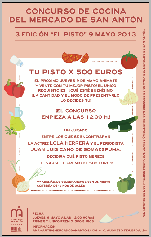 El día 9 de mayo podrás medir tus habilidades en el marco del tercer concurso de cocina organizado por el Mercado de San Antón (C/ Augusto Figueroa, 24). No hace falta apuntarse en ningún lado. Sólo tienes que preparar tu mejor pisto y presentarte en el mercado a las 12 en punto.
