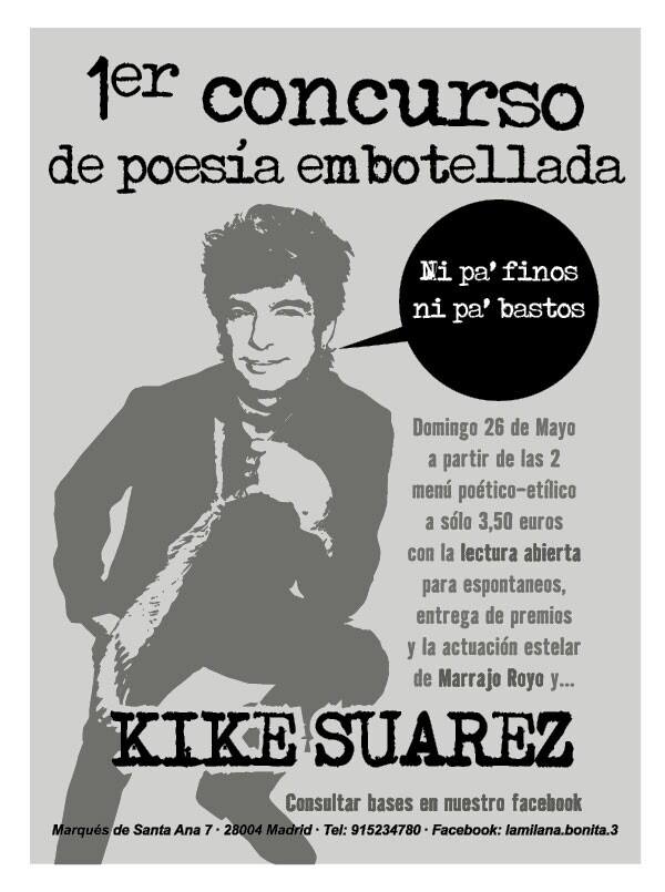 El día 26 de mayo La Milana Bonita (C/ Marqués de Santa Ana, 7) organiza su I concurso de poesía embotellada. Y estáis invitad@s tod@s a participar. Las únicas limitaciones tienen a que ver con el tema, que tiene que ser sobre vinos y bares, y el tamaño, que no debe ser superior a 12 estrofas.