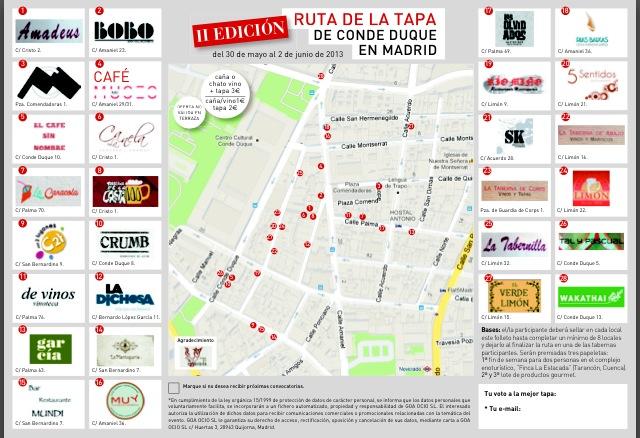 28 locales del barrio nos ofrecen sus propuestas culinarias en miniatura, del jueves 30 de mayo al domingo 2 de junio de 2013. Como siempre, la ruta tiene premio. Si visitad al menos 8 restaurantes, podéis votar la mejor tapa y entrar en el sorteo de 3 premios: un fin de semana para dos personas en el complejo enoturístico Finca la Estacada (Tarancón, Cuenca) o una cesta de productos gourmet.