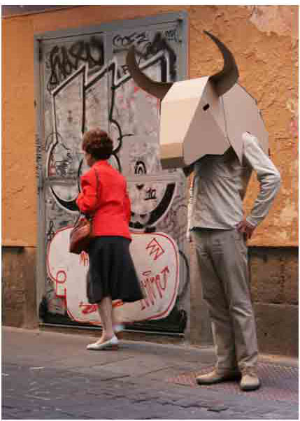 Estas personas, con grandes cabezas de toro de cartón sobre los hombros, quieren rescatar a ese personaje muy español cargado de simbología. Hombre y animal a la vez, monstruo atávico cargado de erotismo… La acción no busca entrar en el debate taurino, quiere más bien representar la resistencia, la valentía y el carácter de este país. Ese toro que puede con todo.