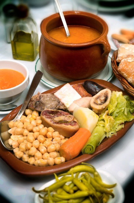 Para amenizar la espera – los fideos de la sopa los cuecen en el momento – nos sirven una copa de cava y unas croquetas caseras. Luego, nos invitan a ponernos un babero, para disfrutar, sin sobresaltos, de la sopa; de la fuente de verduras con patatas nuevas; de las carnes (morcilla casera, chorizo de sarta, huesos de caña, tocino ibérico, carnes de añojo y pollo, puntas de jamón); y cómo no, de los célebres garbanzos, acompañados de piparras, cebolletas y salsa de tomate con comino, ajo y orégano. Ésta última es ideal para facilitar la digestión de un plato suculento a la par que contundente.