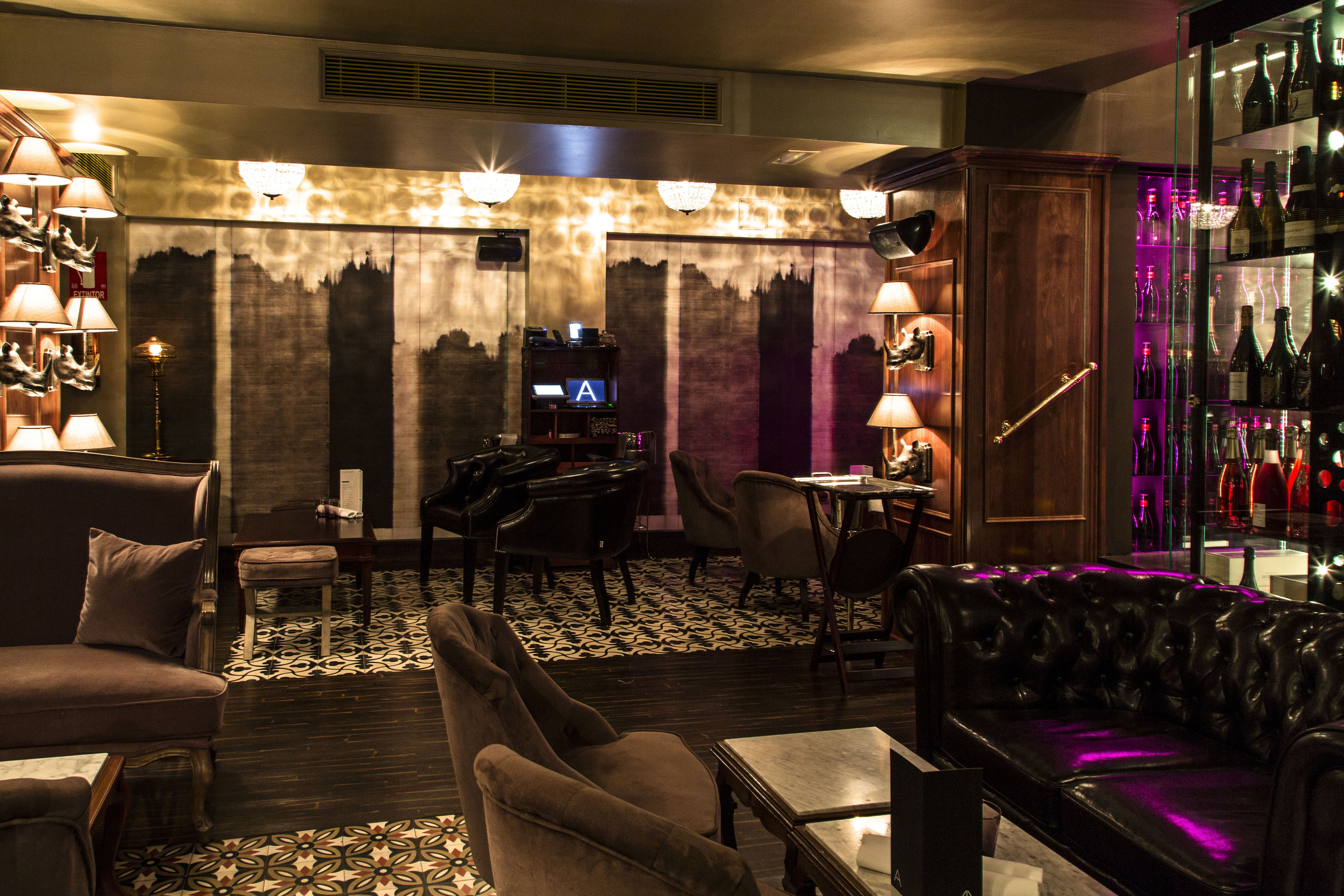Por lo general, el negro es el color protagonista de la decoración. Negra es la larga mesa y las sillas altas del área de coctelería, presidida por un altar en el que brillan las botellas. Negros son butacas, sofás, mesas y paredes de los dos reservados (uno para 12, otro para 4). Mientras que, en el salón estilo british (para 35 comensales) de la planta de abajo el negro se mezcla con los tonos maderas de las paredes o las mesas bajas. En este espacio predominan además, los toques vintage aportados por los sofás chester, los tejidos aterciopelados o las baldosas hidráulicas.