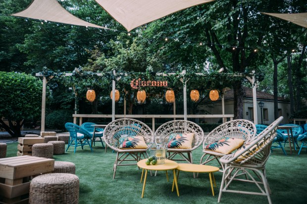 Entre arboles, plantas, hamacas, camas balinesas y sillones de mimbre, el espacio cuenta con una barra, un escenario y una zona de talleres. La ambientación es 100% tropical, siendo el verde, el amarillo y las maderas de color claro los tonos predominantes. Y para que no suframos las altas temperaturas de las tardes estivales, hay aspersores y toldos para dar sombras.