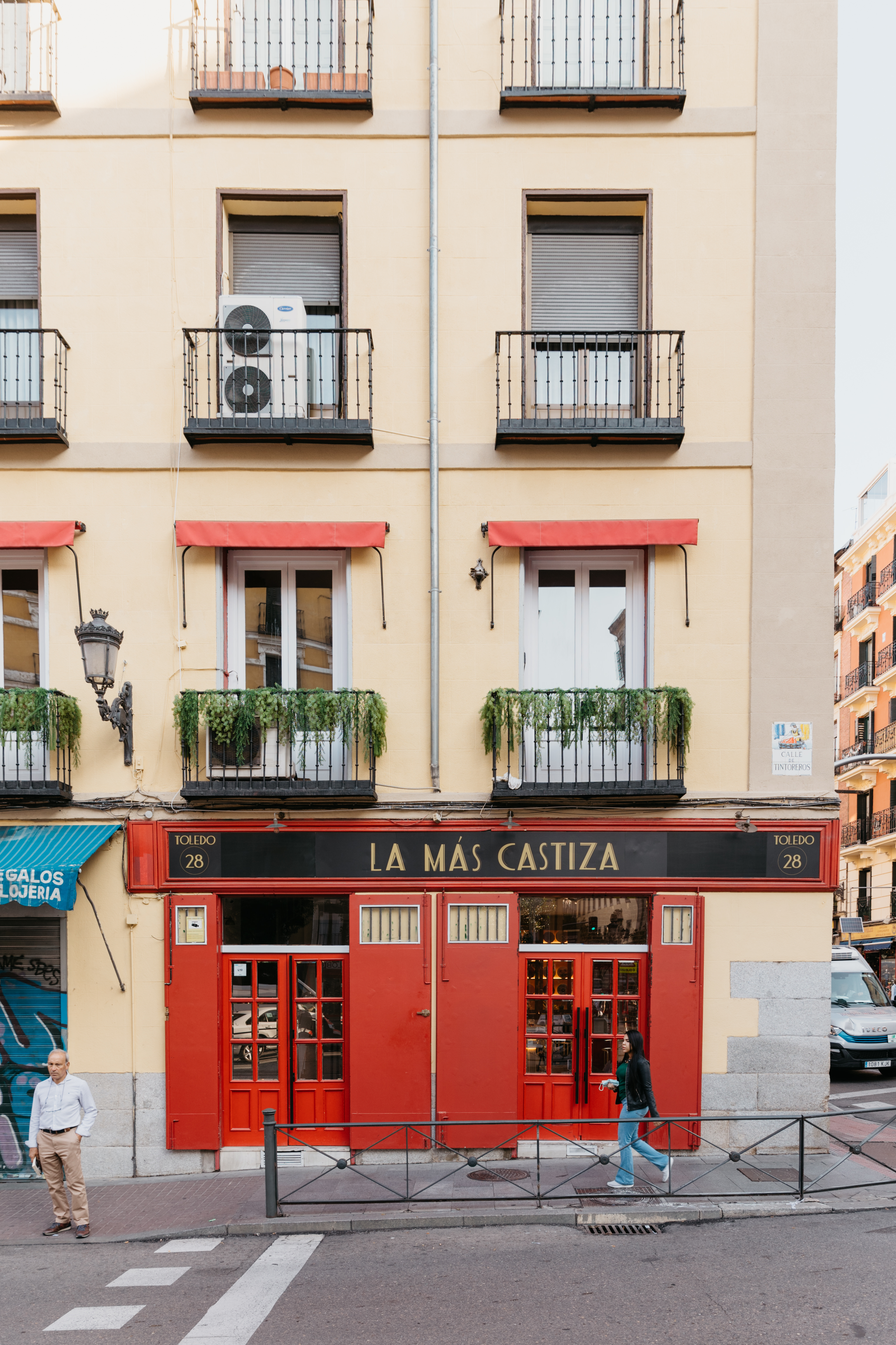 La Más Castiza es toda una declaración de intenciones, a partir de su fachada, un esquinazo pintado de rojo que rinde homenaje a una tradición que viene de hace más de cuatro siglos, cuando una parte de la población no sabía leer y en la capital se pintaban las fachadas de color rojizo para para señalizar las tabernas donde se vendía vino.
