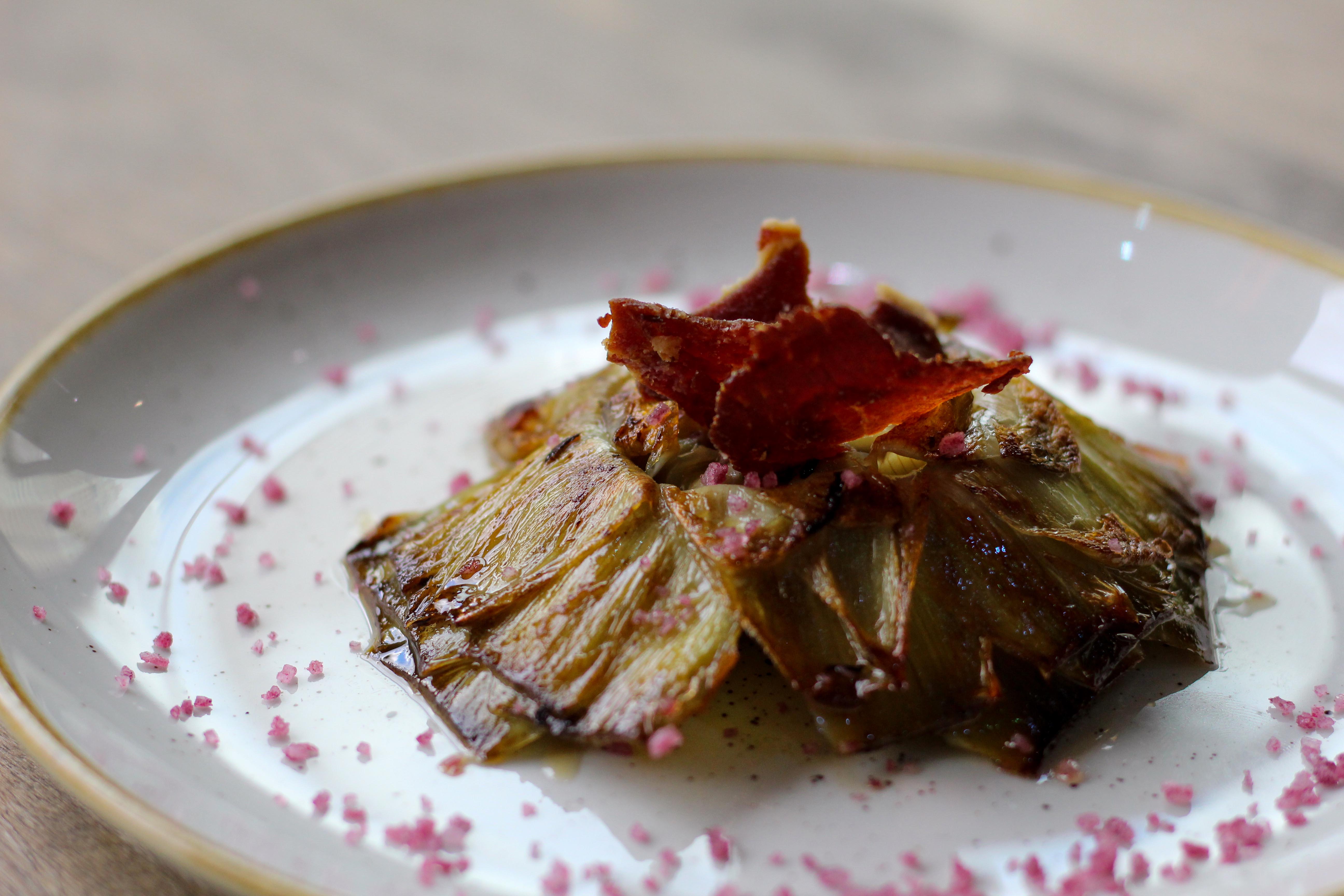 El menú arranca con un plato de temporada: Flor de alcachofa en AOVE con jamón crujiente; continúa con el Pimiento caramelizado al moscatel con virutas de ventresca; y el Huevo trufado en su crema de boletus con base de patata confitada, que presentan en forma de conserva y sin mezclar. En el apartado de cocina fusión presentan las Gyozas de Ragú en su propio jugo y el Chipirón en harina de garbanzo con mahonesa de lima. Y como platos estrellas, encontramos el Canelón de capón con bechamel trufada y peineta de parmesano y la Carrillera Montanera en su jugo con chalota tostada. El postre es, cómo no, una tarta de queso. Pues sí, últimamente parece que en Madrid no hay otra cosa.