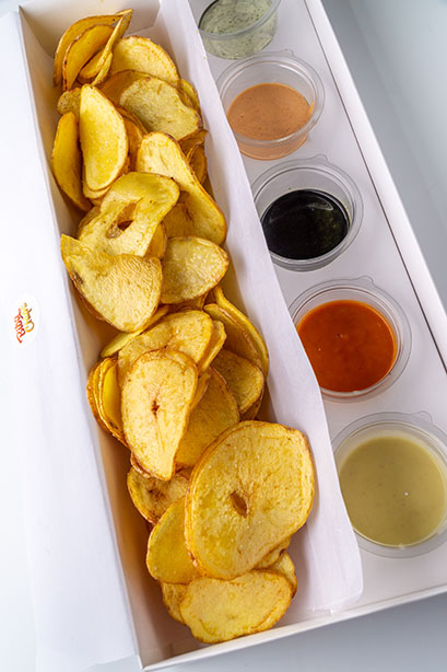Las patatas caseras, también de León, se elaboran al momento y son ideales para ‘dipear’ ya que tienen un grosor más grueso que otras chips. Además de como acompañamiento, puedes degustarlas en cajas de diferentes tamaños y con de entre 2 y 5 salsas.