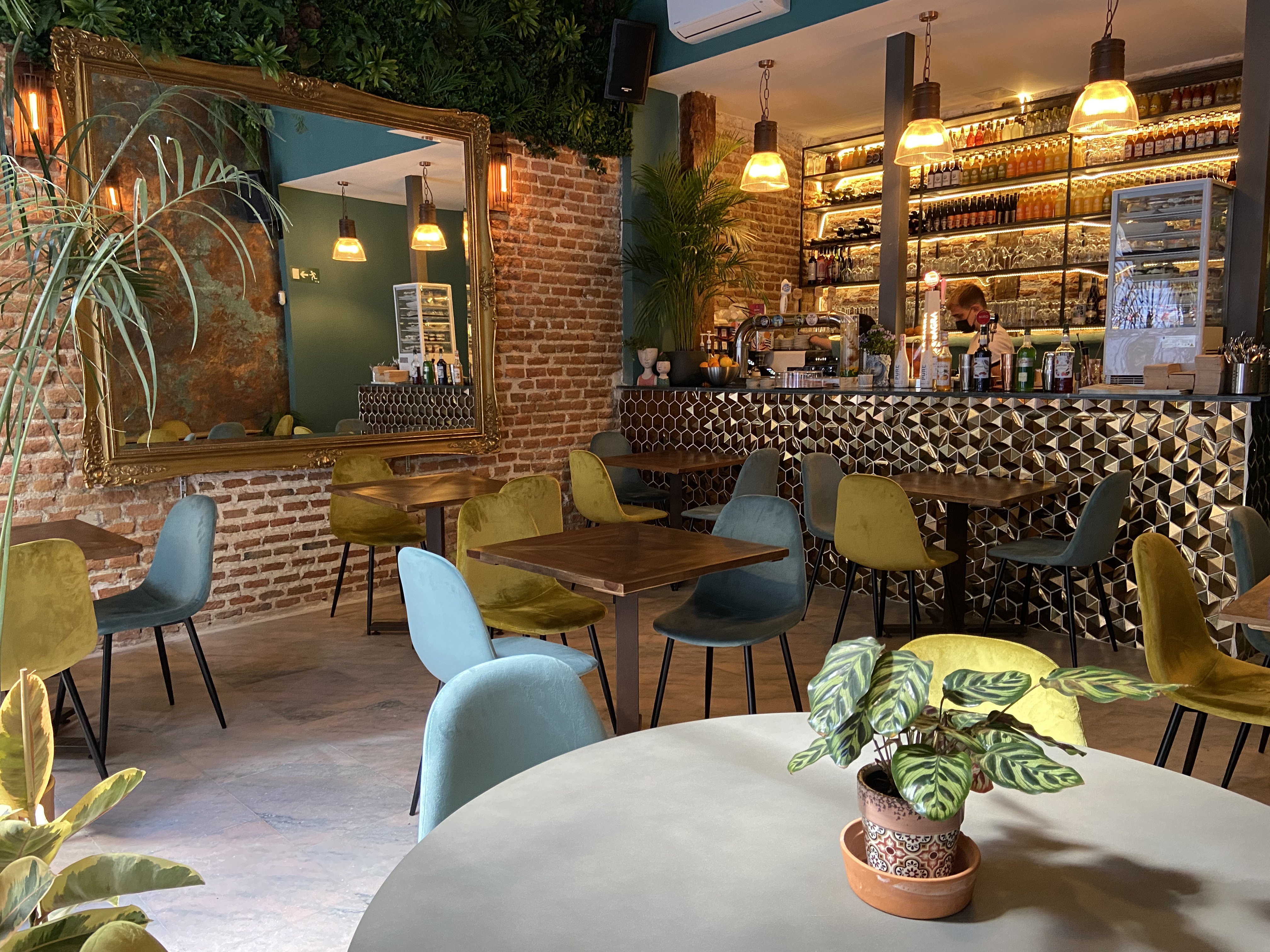 En este lugar, plagado de elementos naturales que se anuncia desde su entrada de hierro forjado y cristal y se recorre con pasos de mármol rosa bajo sus techos vegetales y una cuidada decoración, podemos degustar platos tan sugerentes como Tartar Marinero (pebre, aguacate laminado, carne vegetal marinada en algas y salsa rosa), Korma Kavurma (carne vegetal estilo pollo en salsa Korma y arroz con verduras de temporada), Ensaladilla La Moder (patata asada, zanahoria encurtida, espárragos verdes, alcaparras, luca marinada en algas con veganesa marinera) o Alcachofas de Tudela (alcachofas confitadas, acompañadas de gelatina de vermut y jamón de arroz), entre otros muchos.