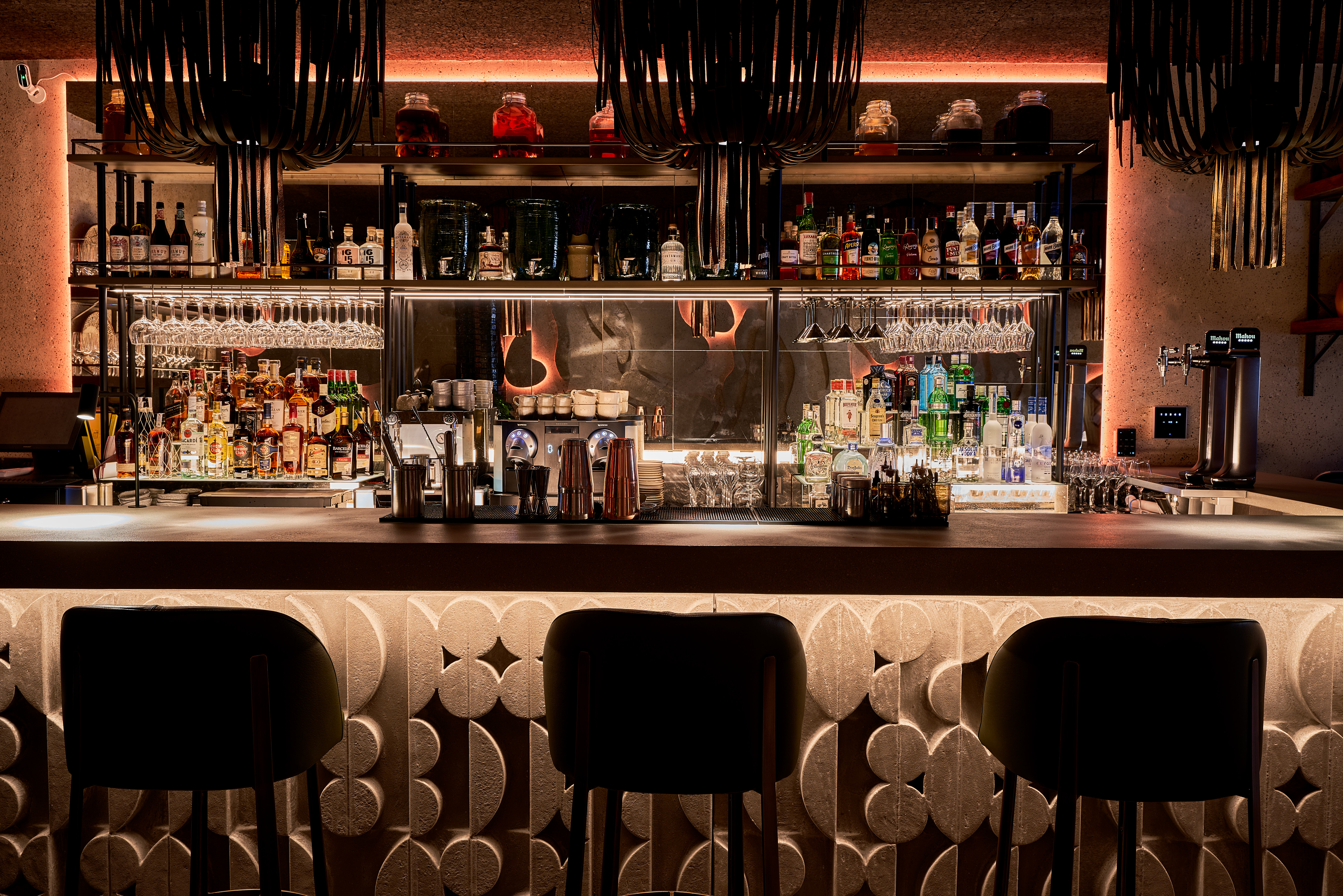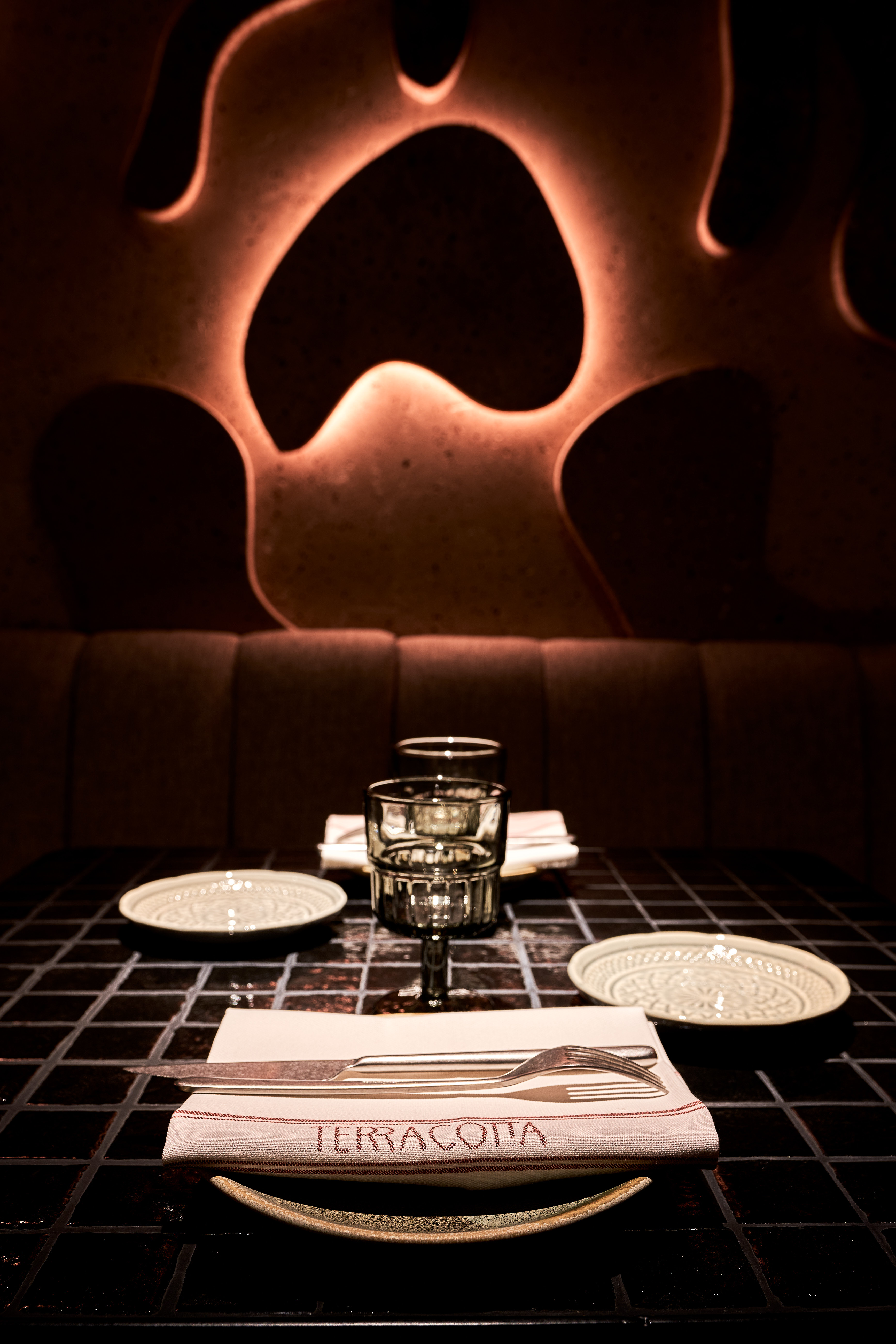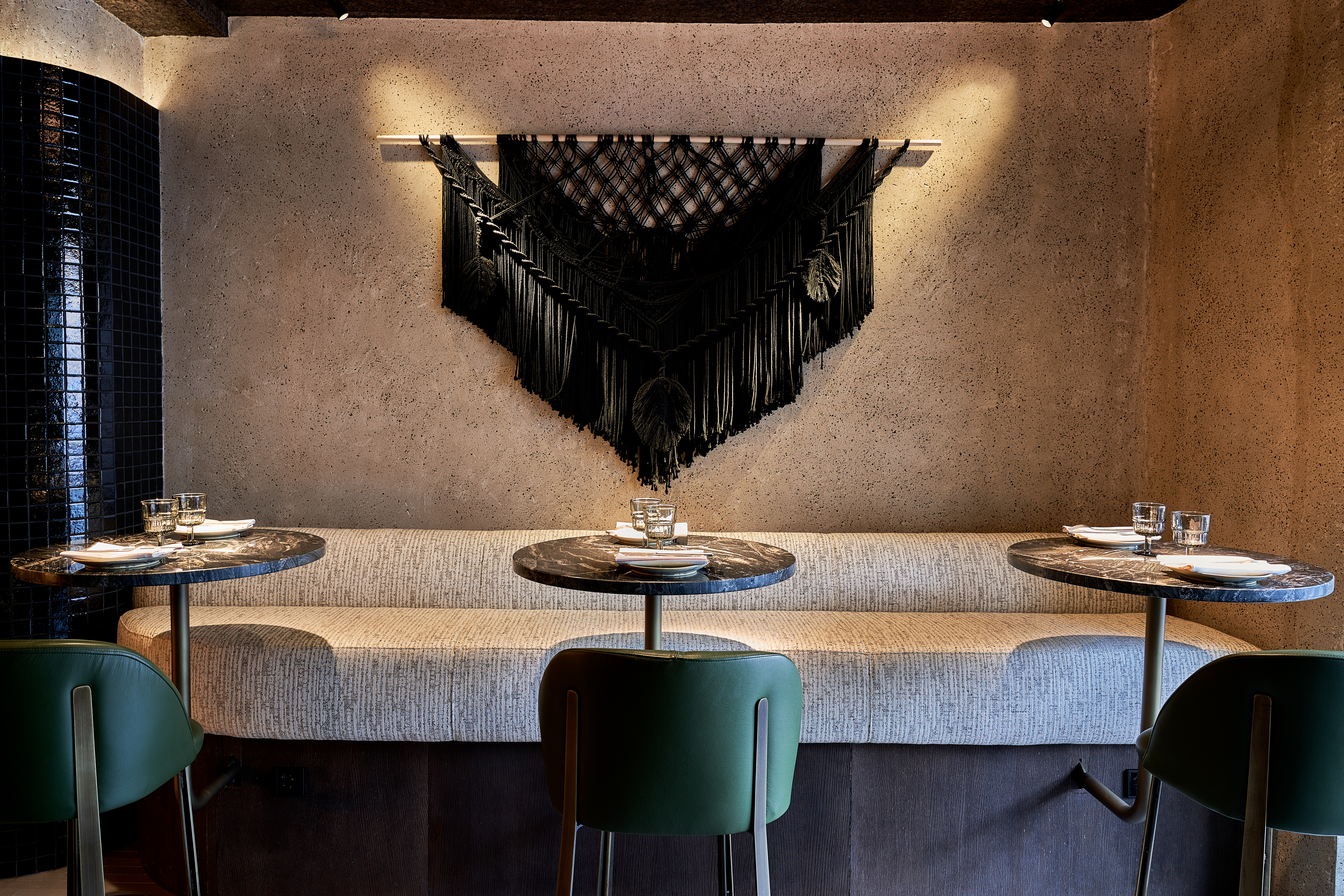 Su concepto se inspira en la terracota, esa arcilla modelada y endurecida al horno que fue el primer material artesano con el que se levantaron imperios y engalanaron palacios y mesas. En la decoración, cálida y acogedora, predominan los tonos tierra calientes que contrastan con toques de un verde que aporta luz y destacan los materiales naturales: el adobe y la arena de las paredes, el corcho natural del techo, las conchas y piedras de las mesas, la piel natural de taburetes y lámparas, el lino de las cortinas y la madera en la planta baja. Por lo general, prevalece lo artesanal hecho a mano, como el macramé negro de dos metros que preside la entrada o los azulejos de algunas de las mesas, colocados uno a uno.