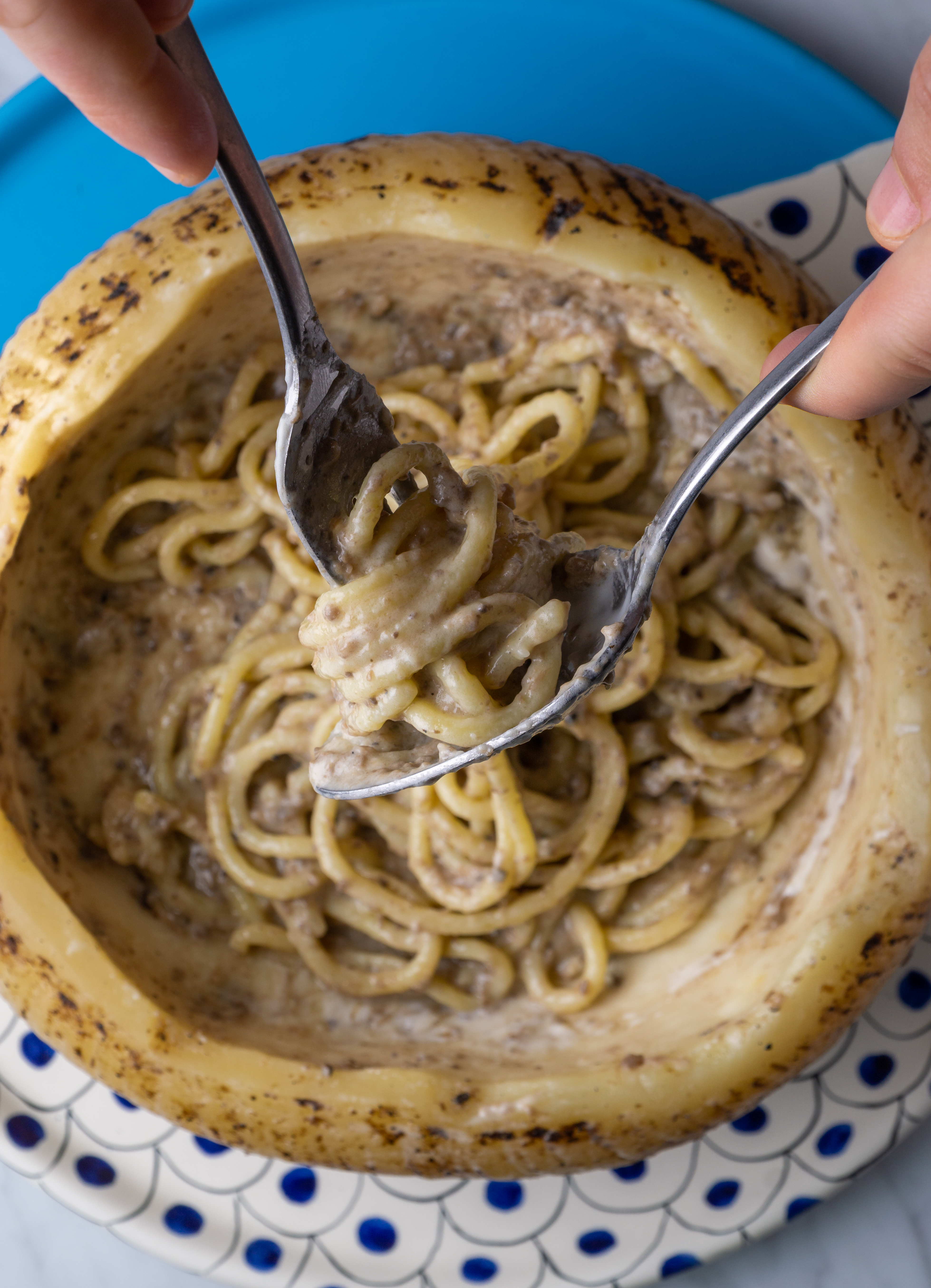 La pasta fresca de Baldoria se elabora en su propio ‘laboratorio’, a plena vista. Hay de dos tipos: al huevo y seca. En ambos casos se emplea harina Molino Passini, de grano tierno. Una de nuestras favoritas es la Cacio & tartufo, unos espaguetis servidos directamente en la rueda de queso con trufa de los Abruzos, espuma de parmesano y salsa de trufa.
