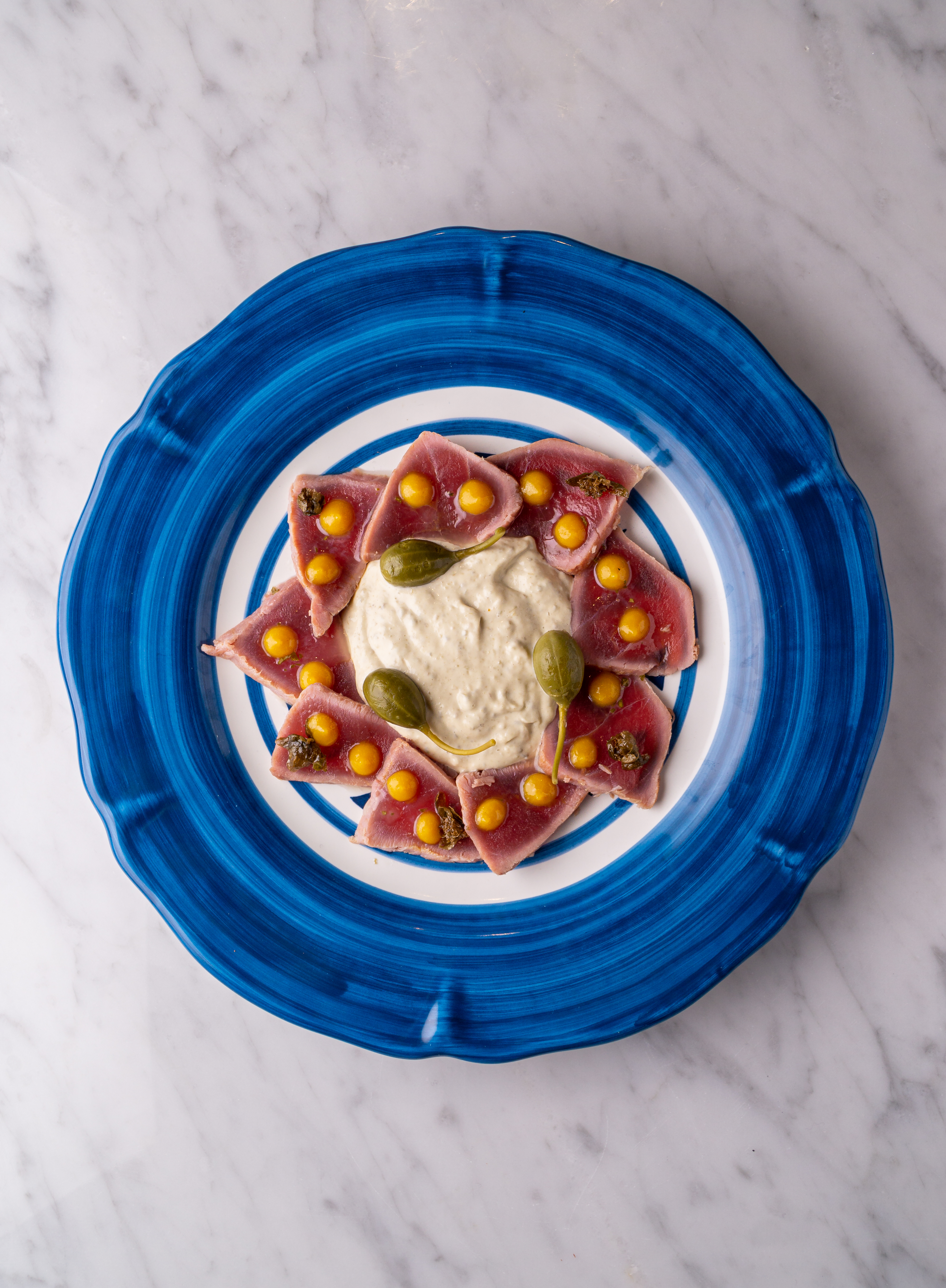 La carta se basa en platos clásicos de la cocina italiana pero con toques de autor, como la focaccia de bellota, un pequeño homenaje a España a través del jamón, colofón de una pizzetta marinara, típica de Nápoles, coronada con salsa de tomate espesa, ajo y orégano; las croquetas a la parmigiana, un entrante con alma de trampantojo: parecen croquetas, pero están rellenas de berenjena; o el tonno tonnato: en lugar de recurrir a la tradicional receta de vitello tonnato, con ternera, se presenta un tataki de atún con salsa de atún y alcaparras.