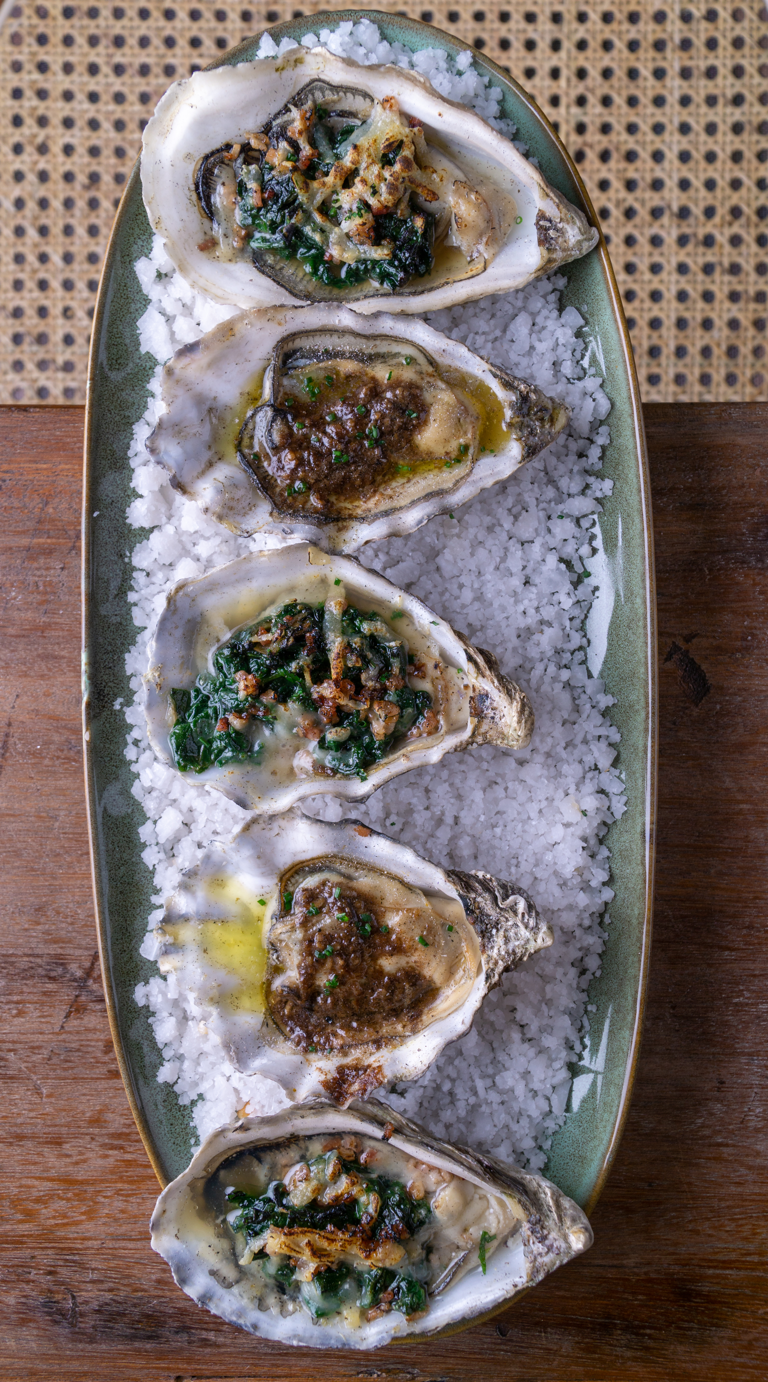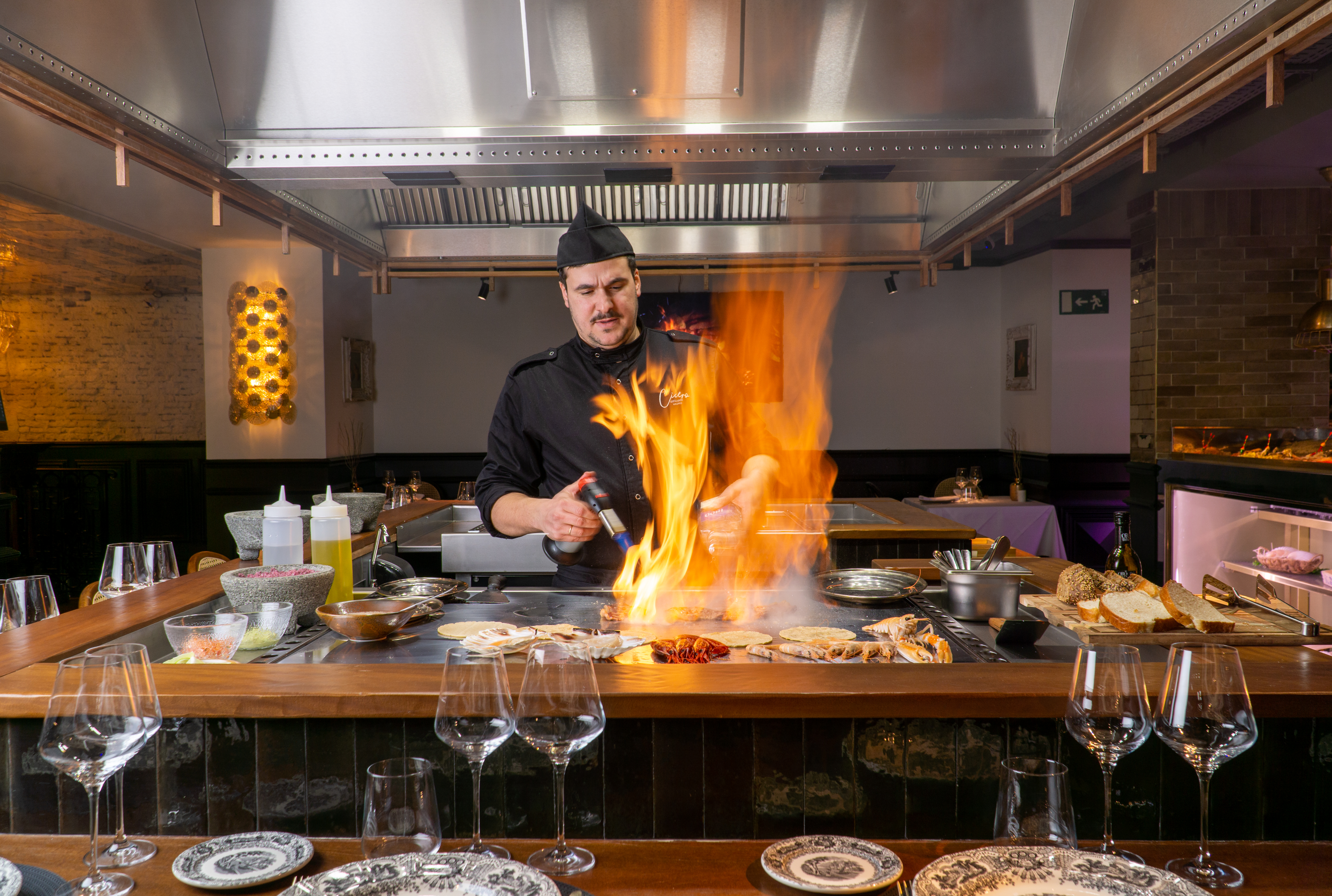 Esta nueva apertura cuenta con tres espacios: el comedor, con vistas a un alegre jardín urbano; la cocina; y la mesa de show cooking, su punto fuerte. Se trata de una mesa, con parrilla incorporada y chef propio, que ofrece una experiencia comunal a 18 personas —con un mínimo de dos para que esté operativa—. Está disponible para un turno en almuerzos —a las 14.00 h— y en dos para las cenas —20.15 y 22.00 h—. Actualmente en ella se proponen tres menús, uno de cuatro pases, otro de cinco y uno de seis (de 45 a 75 euros). Es posible completarlos con un maridaje con cuatro copas de vino y tres precios diferentes en función de la exclusividad de las etiquetas (de entre 25 y 60 euros).