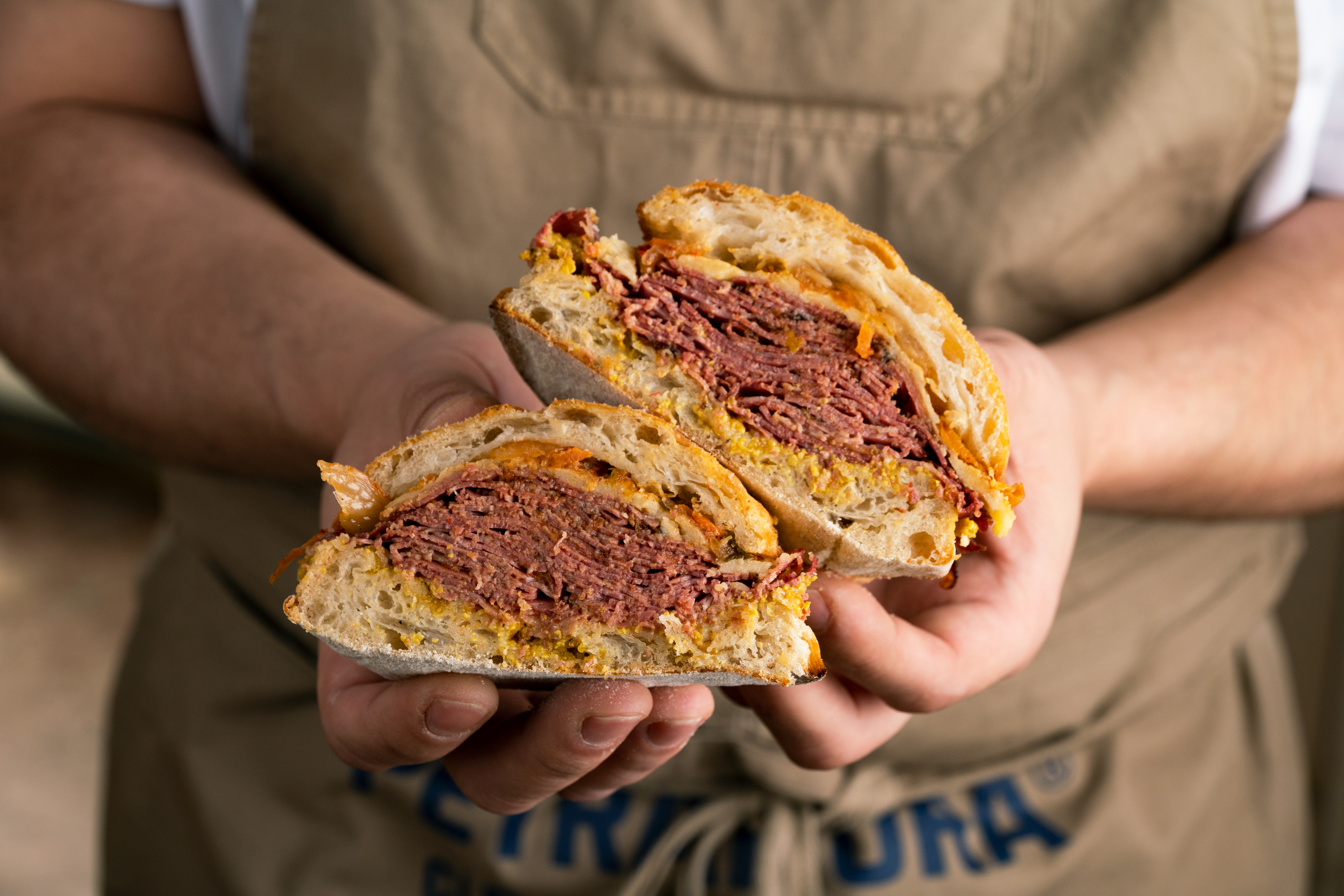 Lo mejor del bocadillo de pastrami son sin duda, su focaccia de masa madre de fermentación lenta con aceite de oliva, el pastrami curado y ahumado, los pepinos encurtidos con vinagre de arroz del chef estrella Michelin Jordi Vilà la salsa agridulce de ciruelas de este último.