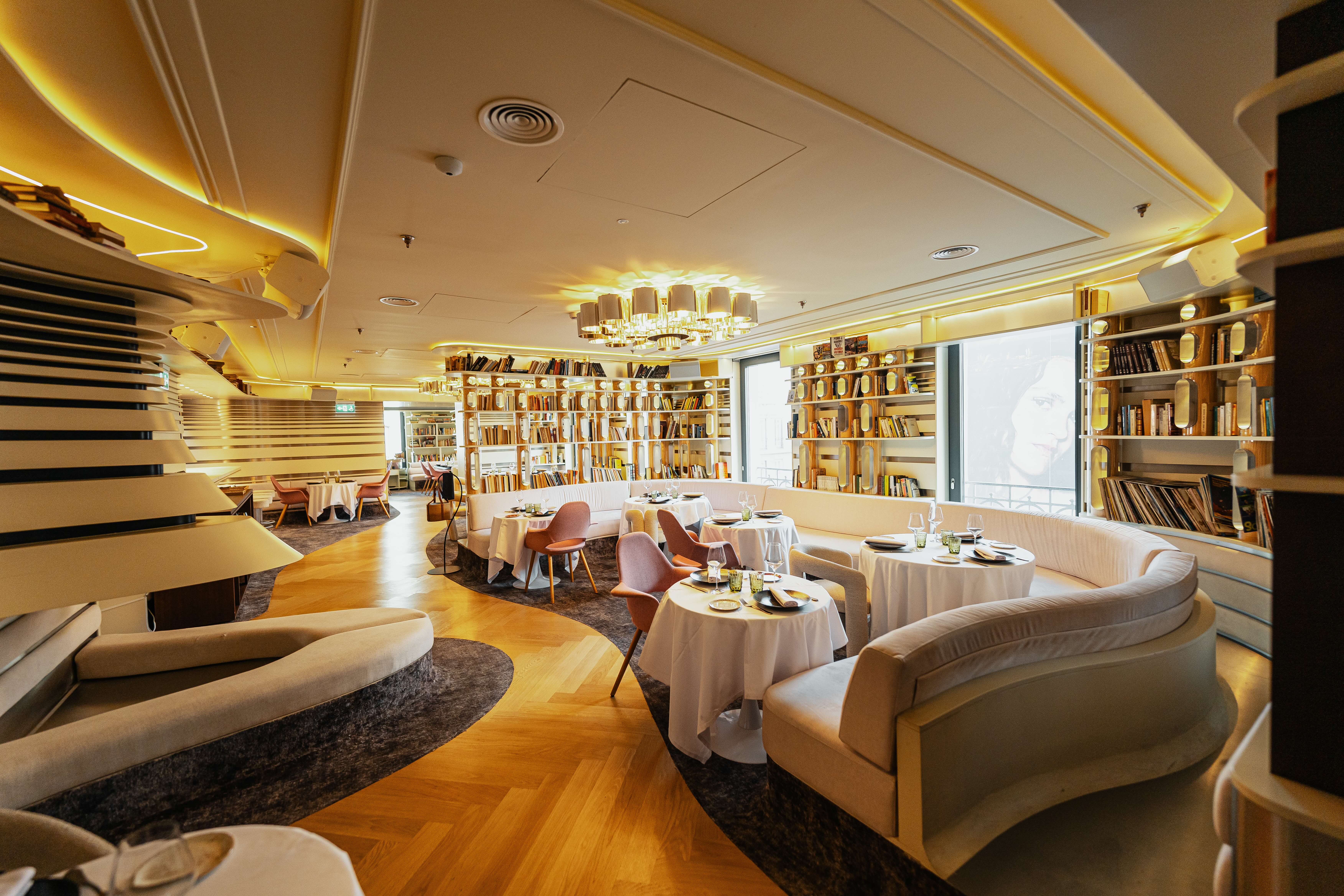 Apunta esta dirección, si buscas un refugio de diseño, tras una tarde de compras por Gran Vía, en el que incluso puedes gozar de vistas a la artería principal de la ciudad. Situado en las últimas dos plantas del WOW Concept, este espacio se alza sobre el histórico edificio del antiguo Hotel Roma. Su interiorismo, obra del estudio External Reference, combina el retro-futurismo de los años 70 con toques de sofisticación: sofás curvos, librerías repletas de vinilos y un ambiente que invita a perder la noción del tiempo.
